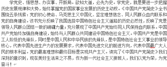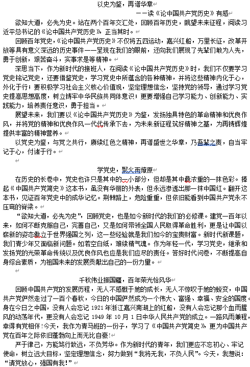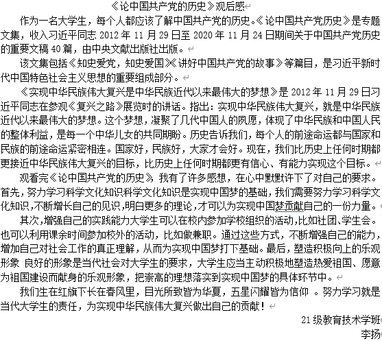 为深入开展党史学习教育,提升青年的思想素养,我院青马班和全院青年进行了“学党史、强信念、跟党走”学习教育。通过学习研读党史书籍并作心得感悟进一步了解了中国共产党发展、活动、斗争的历程,将学习和传承党史内化于心,外化于行。