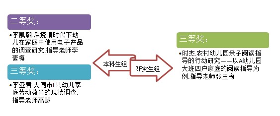 2021年8月11日,由中国高等教育学会教师教育分会主办的第十五届全国高校学前教育专业优秀毕业论文评选结果揭晓。本次评选特邀华东师范大学、南京师范大学、华南师范大学、四川师范大学、浙江师范大学杭州幼儿师范学院、杭州师范大学、河南大学等院校的部分学科带头人组成评选委员会,采用双盲方式评选出优秀论文。我院学前教育专业推选的3篇学生论文从全国70余所院校上报的1100余篇的论文中脱颖而出。