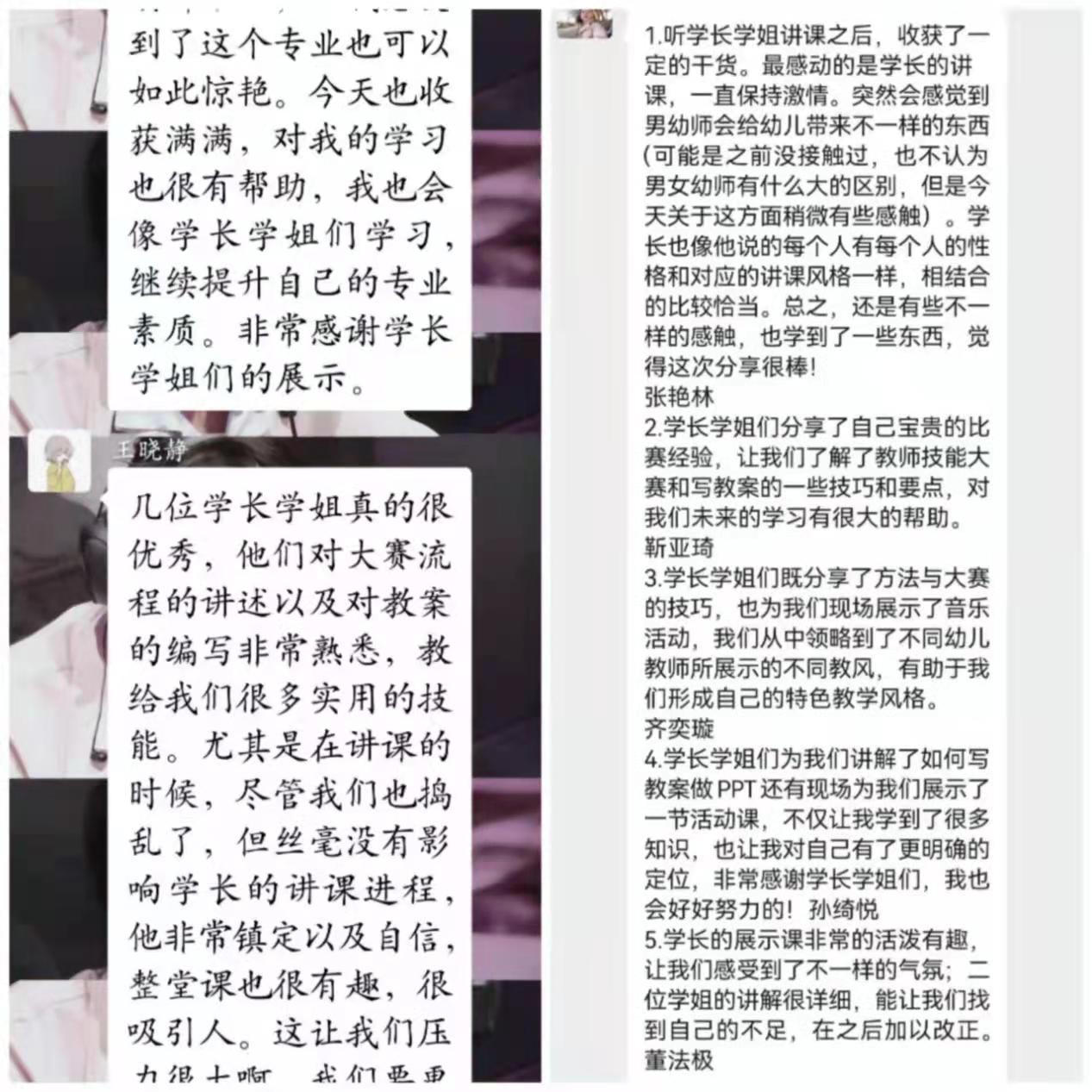 整个过程持续一个多月,为了方便指导教师与同学们进行及时沟通,建立了“教师技能大赛”的微信群。笔试部分每周都会进行一次测试。歌曲弹唱和歌表演每周进行两次指导,每次指导时间持续3个小时左右,每位同学单独把所有参赛曲目进行弹唱,老师们也会为不同的同学编排不同的舞蹈动作,参赛同学在教师技能大赛的微信群里每天发视频进行汇报,老师们进行线上指导。教学设计和模拟教学部分大约每隔一天都会进行面对面辅导,指导老师提供优秀的教案及幼儿园优秀教学视频供同学们选择,参赛同学制作教案进行展示,老师们会逐一指出问题让其修改或重新选择教案;五个领域的教案初步确定后,每次每位同学会展示2~3个领域,老师们会对每位同学进行更加细致、全面的指导。所有指导老师都在辛勤付出,或是专程来新校区指导、或是在上完课之后再为同学们辅导,即使回到家中仍然在线上指导同学们修改、完善教案;参赛同学也非常努力、认真,不断打磨教案、完善课件、调整教态,不断进行反思提高。