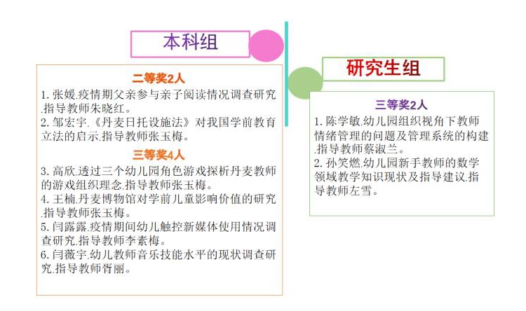 2020年9月11日,由中国高等教育学会教师教育分会主办的第十四届全国高校学前教育专业优秀毕业论文评选结果揭晓。本次评选特邀华东师范大学、南京师范大学、华南师范大学、四川师范大学、浙江师范大学等院校的部分学科带头人组成评选委员会,采用双盲方式评选出优秀论文。我院学前教育专业推选的8篇学生论文从全国80余所院校上报的1300余篇的论文中脱颖而出。