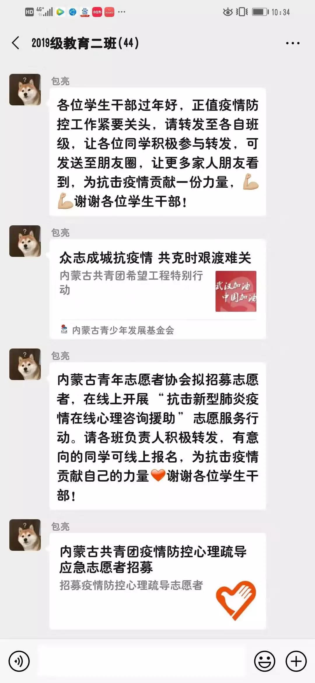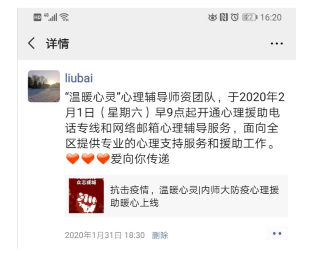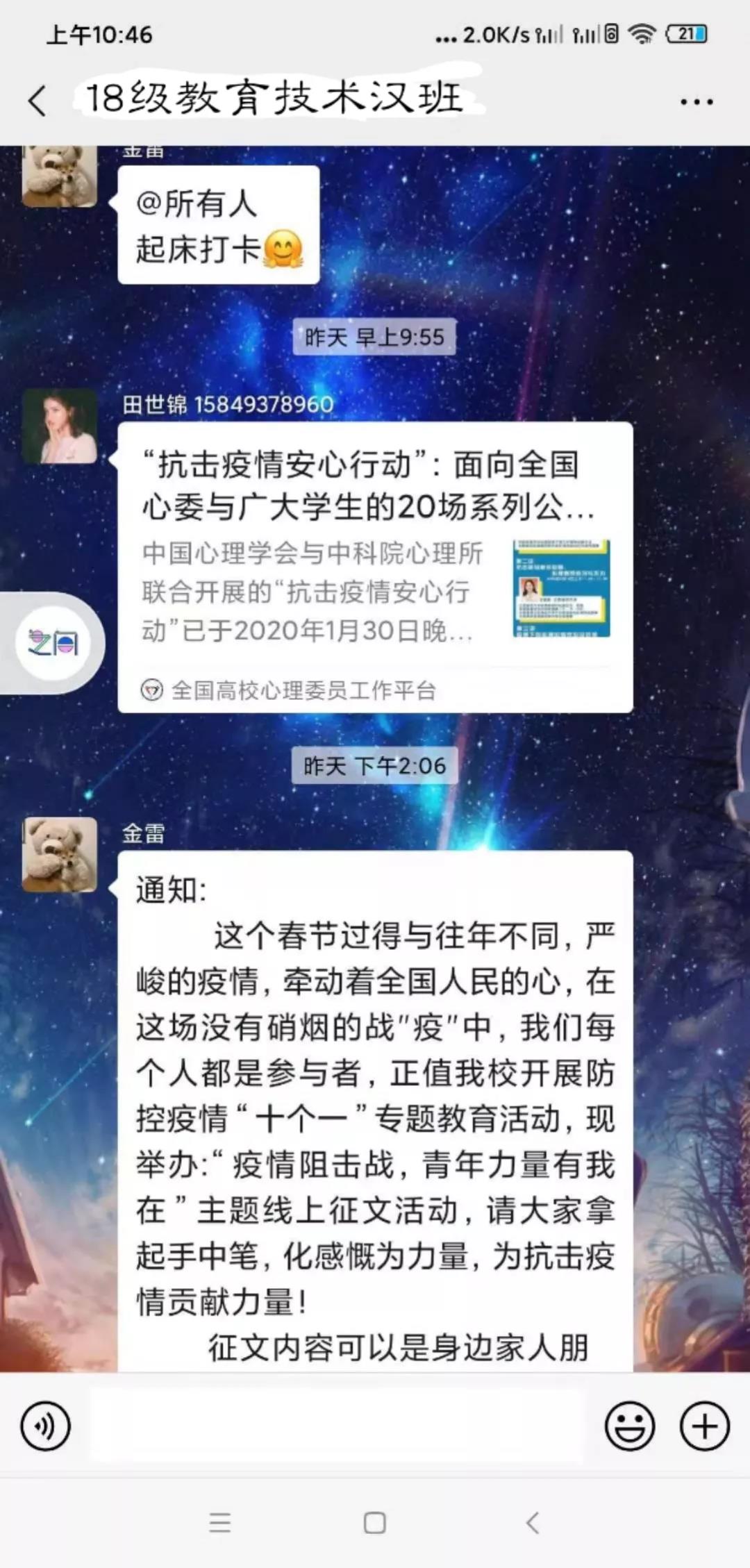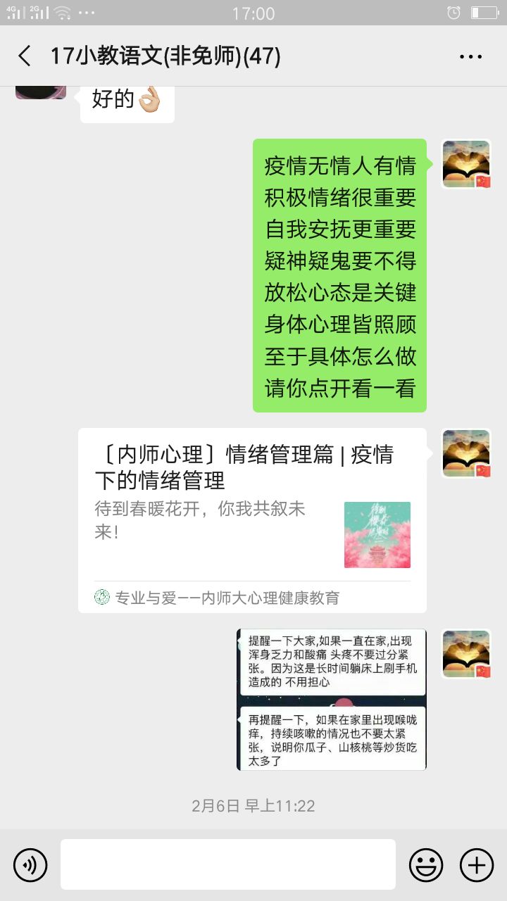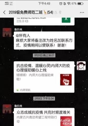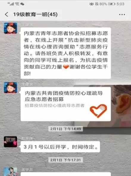 在这共克时艰的特殊时期,yl6809永利集团各班心理委员牢记自己的责任和使命,密切关注同学们的心理动态,积极对同学们进行心理辅导,转发心理疏导的相关文章,极大地缓解了同学们焦虑不安的心情。