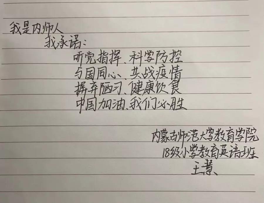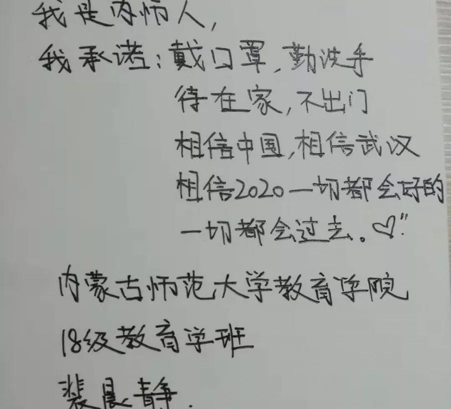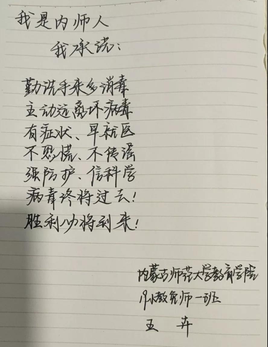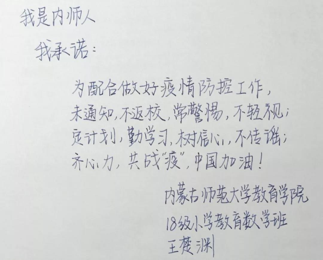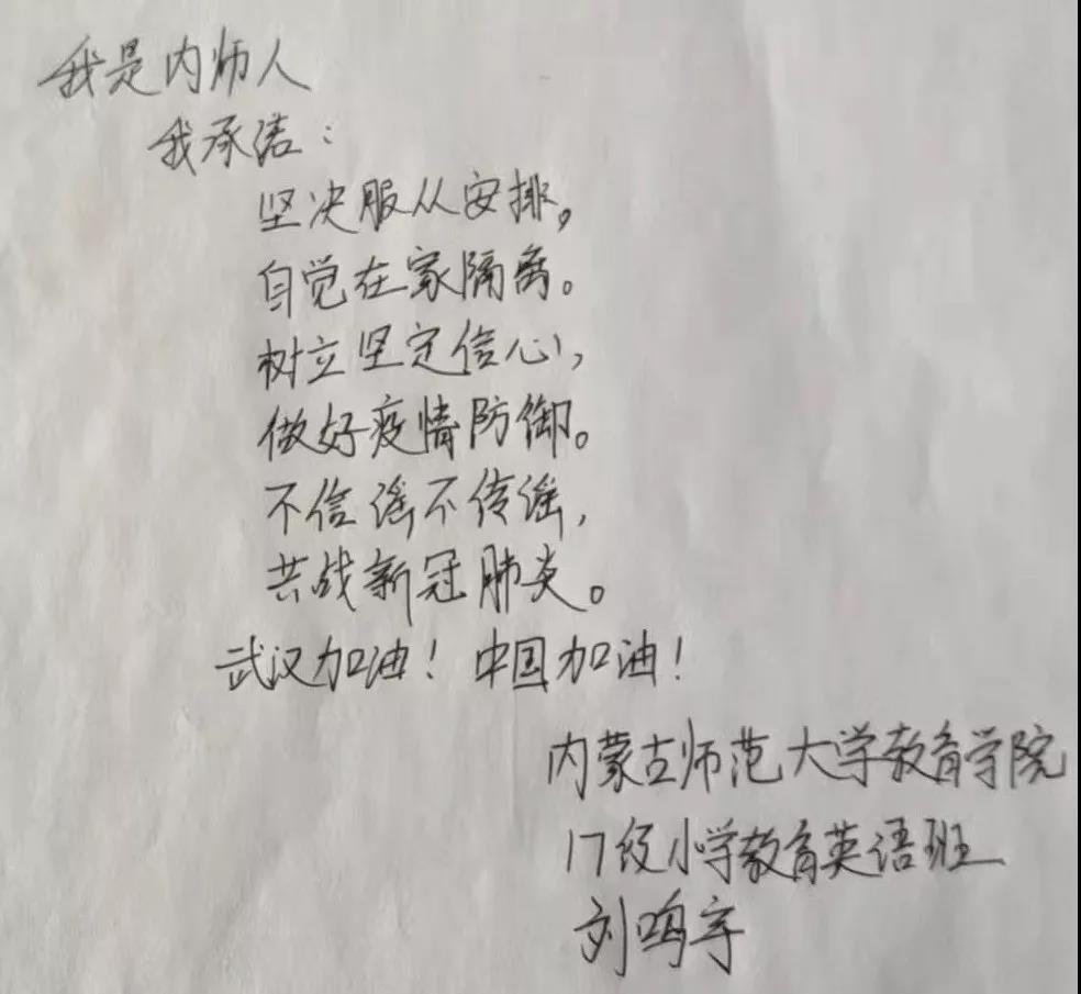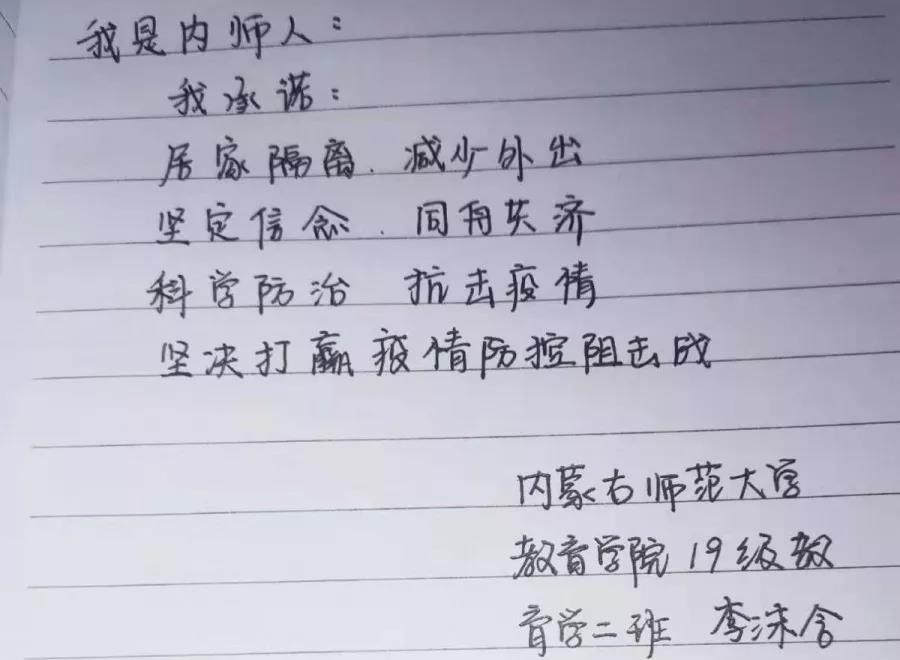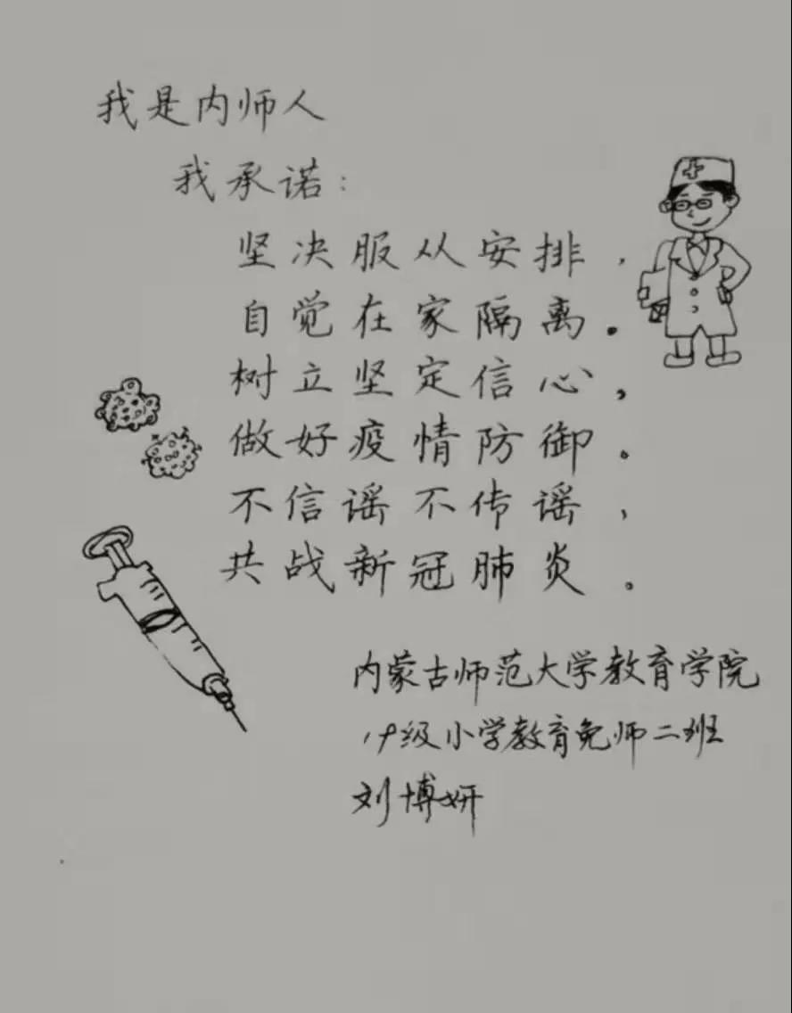 为落实好中央、自治区和学校应对新型冠状病毒感染肺炎相关工作精神,按照共青团中央、自治区团委“关于坚持党的领导,全团动员,在疫情防控阻击战中充分发挥共青团生力军和突击队作用的通知”要求,配合学校团委开展共青团防控疫情“十个一”专题教育活动,引导同学们正确认识疫情,积极应对疫情防控,yl6809永利集团组织开展“防范疫情,从我做起!我是内师人,我承诺!”网络承诺接力活动,发动学生党员、学生干部带领全院学生践行承诺,积极响应号召,服从指挥,保持联络通畅,不提前返校,做到戴口罩、勤洗手,少出门、不聚餐,不信谣、不传谣、不造谣,做运动、不虚度。同学们写下承诺,以笔战“疫”,用实际行动彰显当代大学生的责任与担当,与前线的“逆行者”共同筑起“抗疫”新长城!