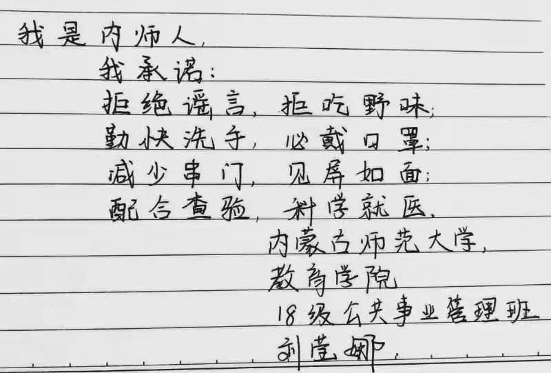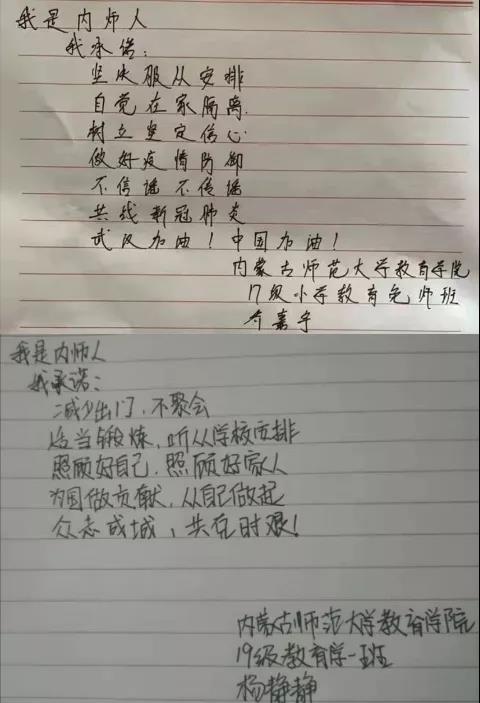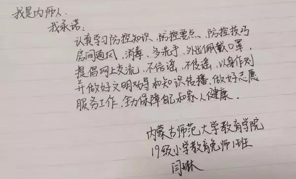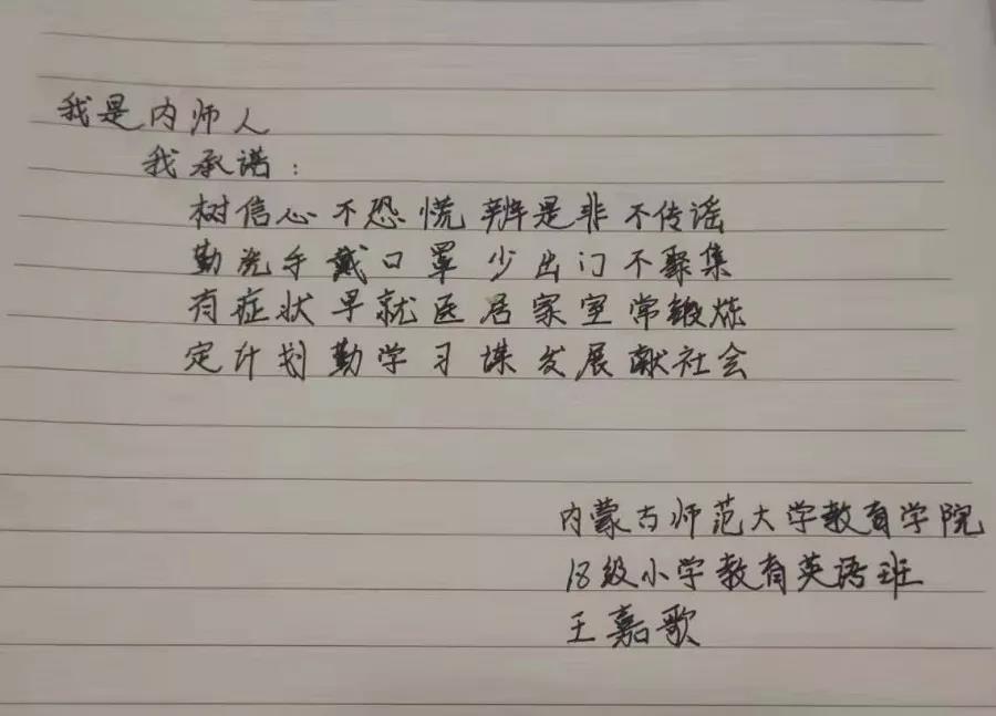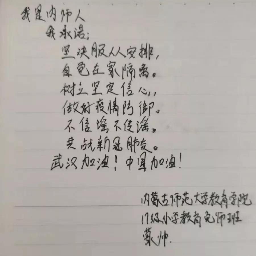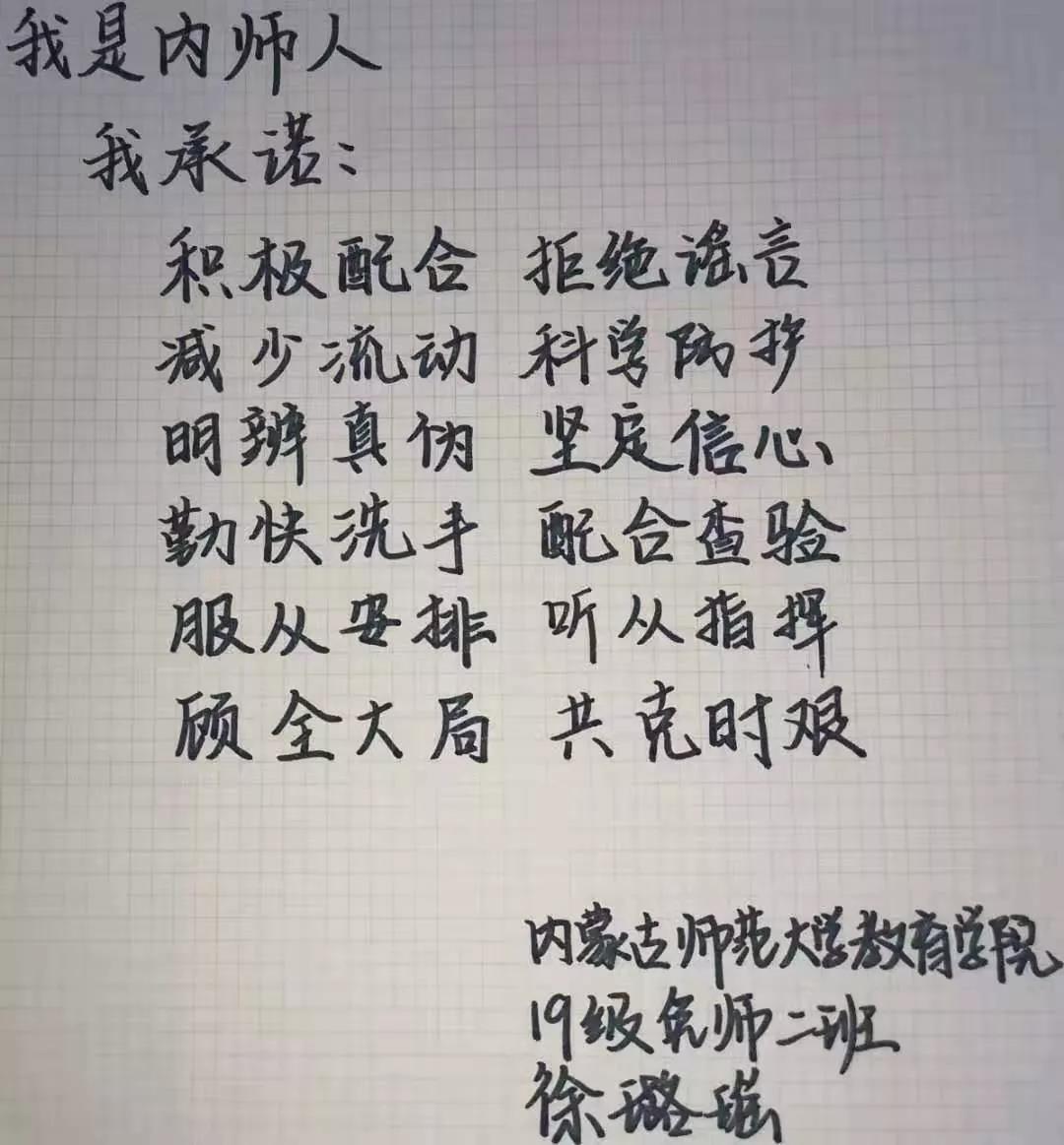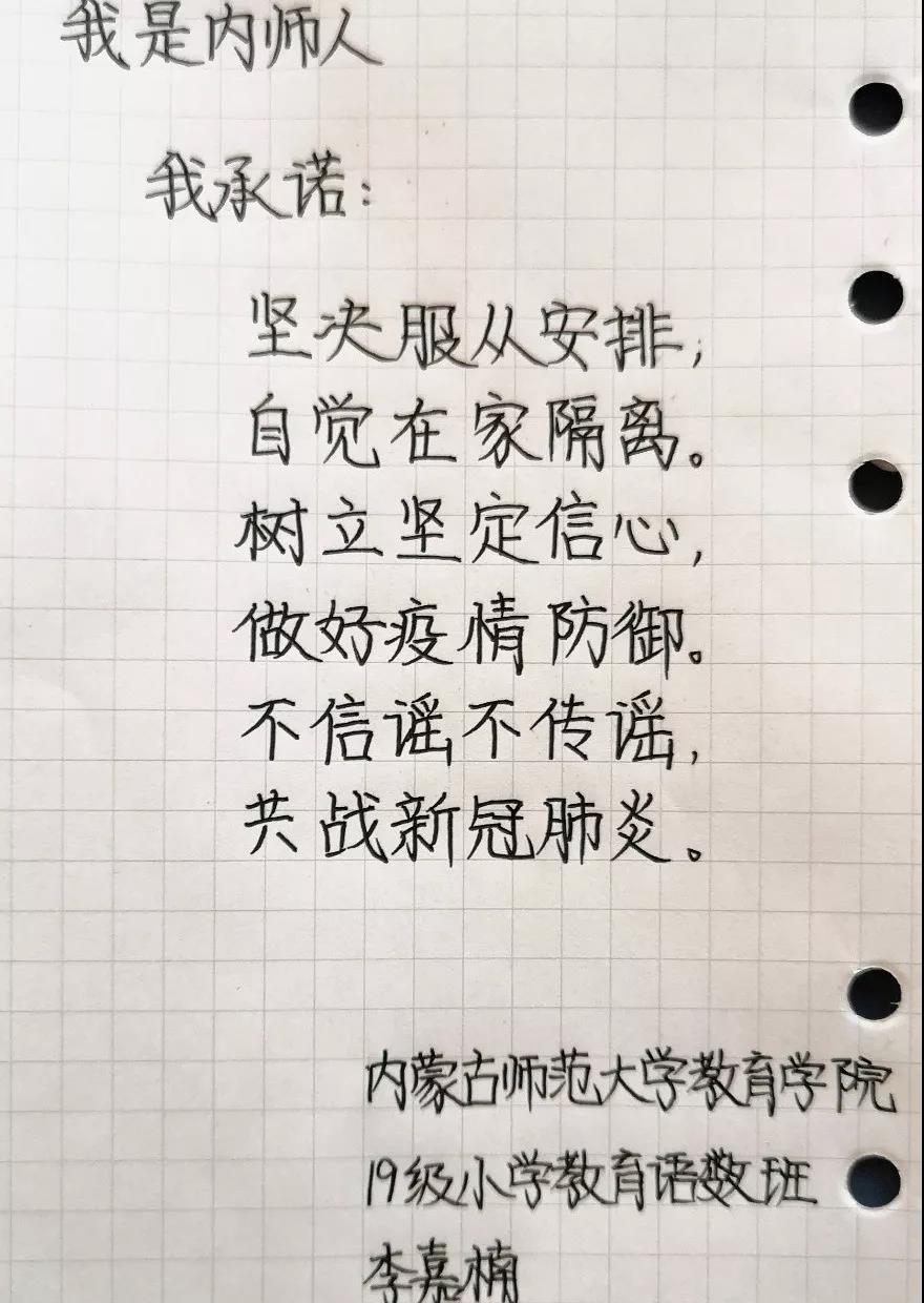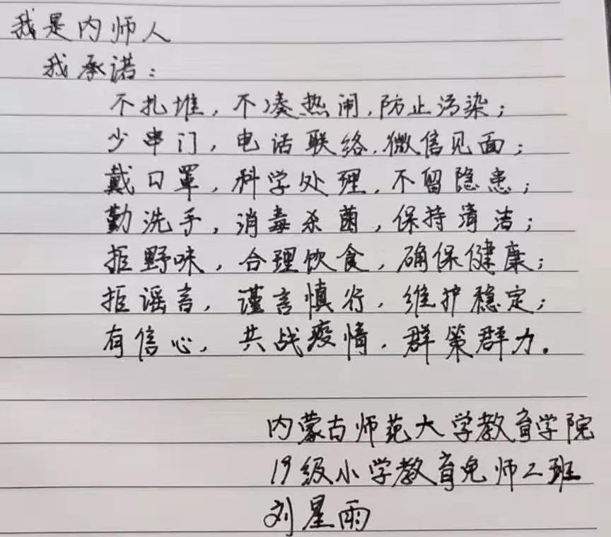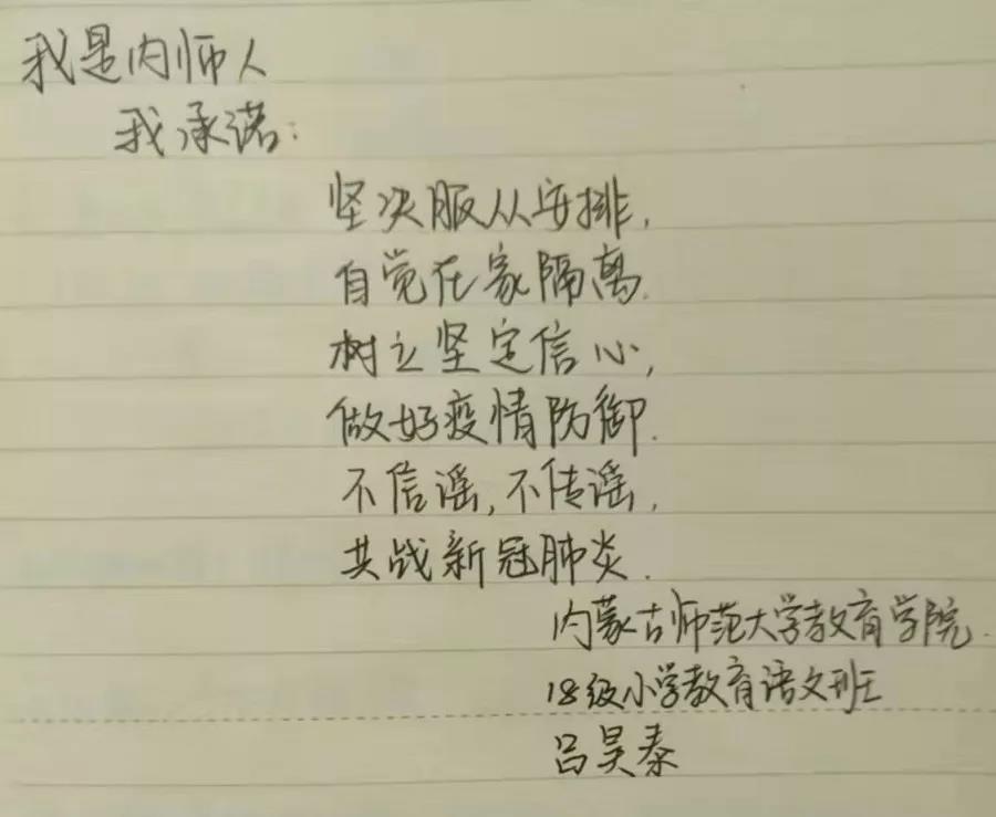 为落实好中央、自治区和学校应对新型冠状病毒感染肺炎相关工作精神,按照共青团中央、自治区团委“关于坚持党的领导,全团动员,在疫情防控阻击战中充分发挥共青团生力军和突击队作用的通知”要求,配合学校团委开展共青团防控疫情“十个一”专题教育活动,引导同学们正确认识疫情,积极应对疫情防控,yl6809永利集团组织开展“防范疫情,从我做起!我是内师人,我承诺!”网络承诺接力活动,发动学生党员、学生干部带领全院学生践行承诺,积极响应号召,服从指挥,保持联络通畅,不提前返校,做到戴口罩、勤洗手,少出门、不聚餐,不信谣、不传谣、不造谣,做运动、不虚度。同学们写下承诺,以笔战“疫”,用实际行动彰显当代大学生的责任与担当,与前线的“逆行者”共同筑起“抗疫”新长城!