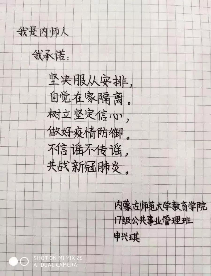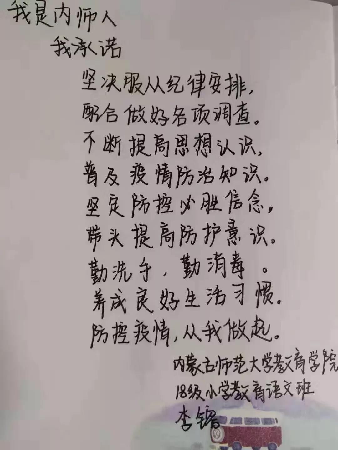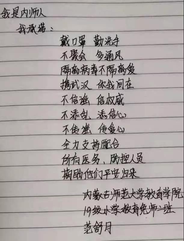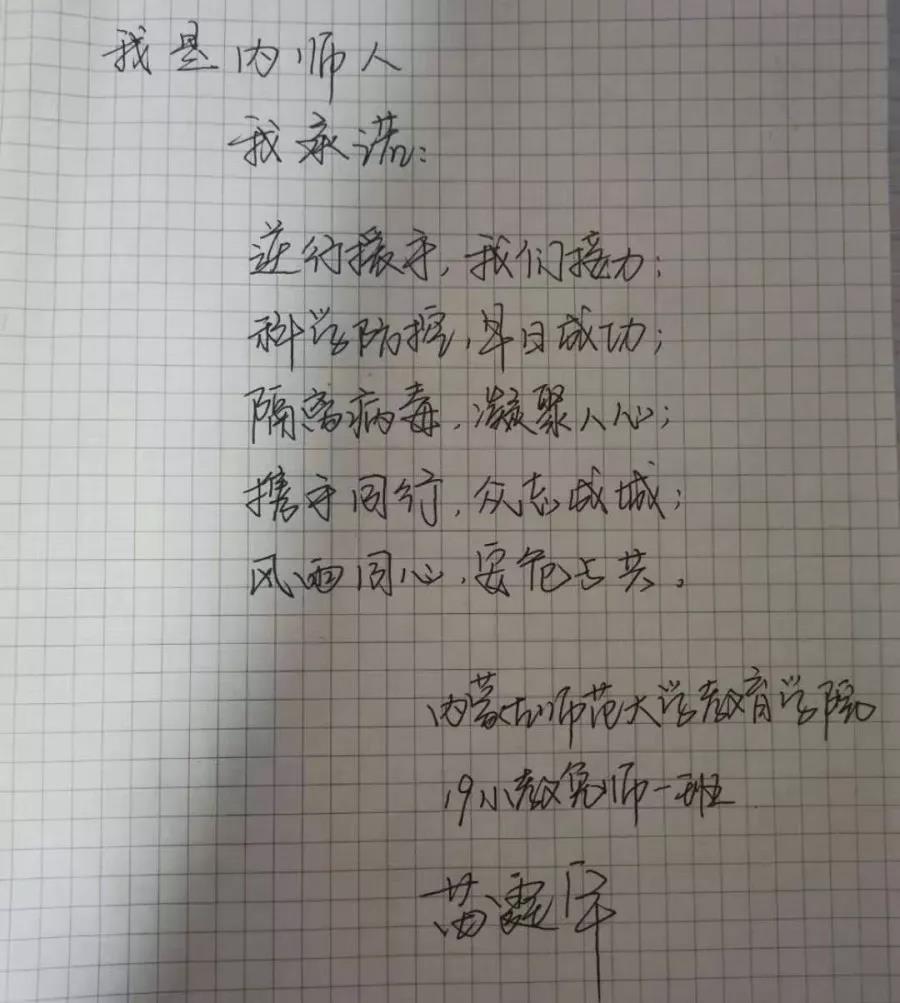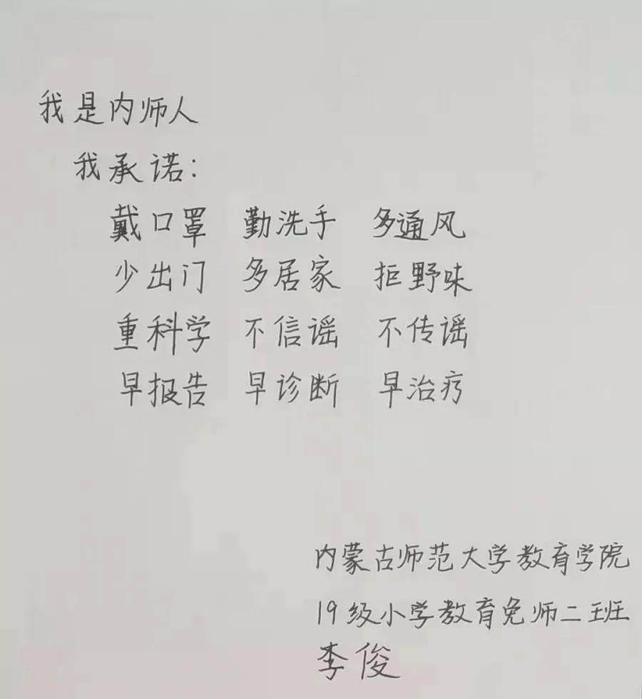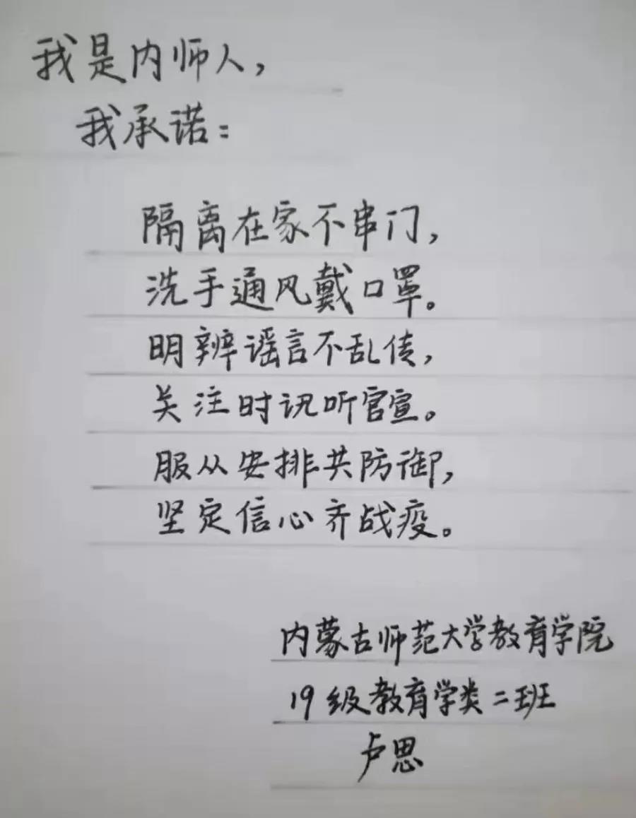 为落实好中央、自治区和学校应对新型冠状病毒感染肺炎相关工作精神,按照共青团中央、自治区团委“关于坚持党的领导,全团动员,在疫情防控阻击战中充分发挥共青团生力军和突击队作用的通知”要求,配合学校团委开展共青团防控疫情“十个一”专题教育活动,引导同学们正确认识疫情,积极应对疫情防控,yl6809永利集团组织开展“防范疫情,从我做起!我是内师人,我承诺!”网络承诺接力活动,发动学生党员、学生干部带领全院学生践行承诺,积极响应号召,服从指挥,保持联络通畅,不提前返校,做到戴口罩、勤洗手,少出门、不聚餐,不信谣、不传谣、不造谣,做运动、不虚度。同学们写下承诺,以笔战“疫”,用实际行动彰显当代大学生的责任与担当,与前线的“逆行者”共同筑起“抗疫”新长城!