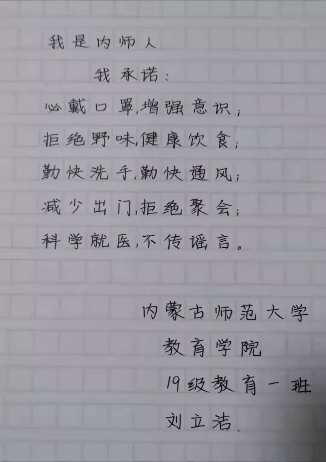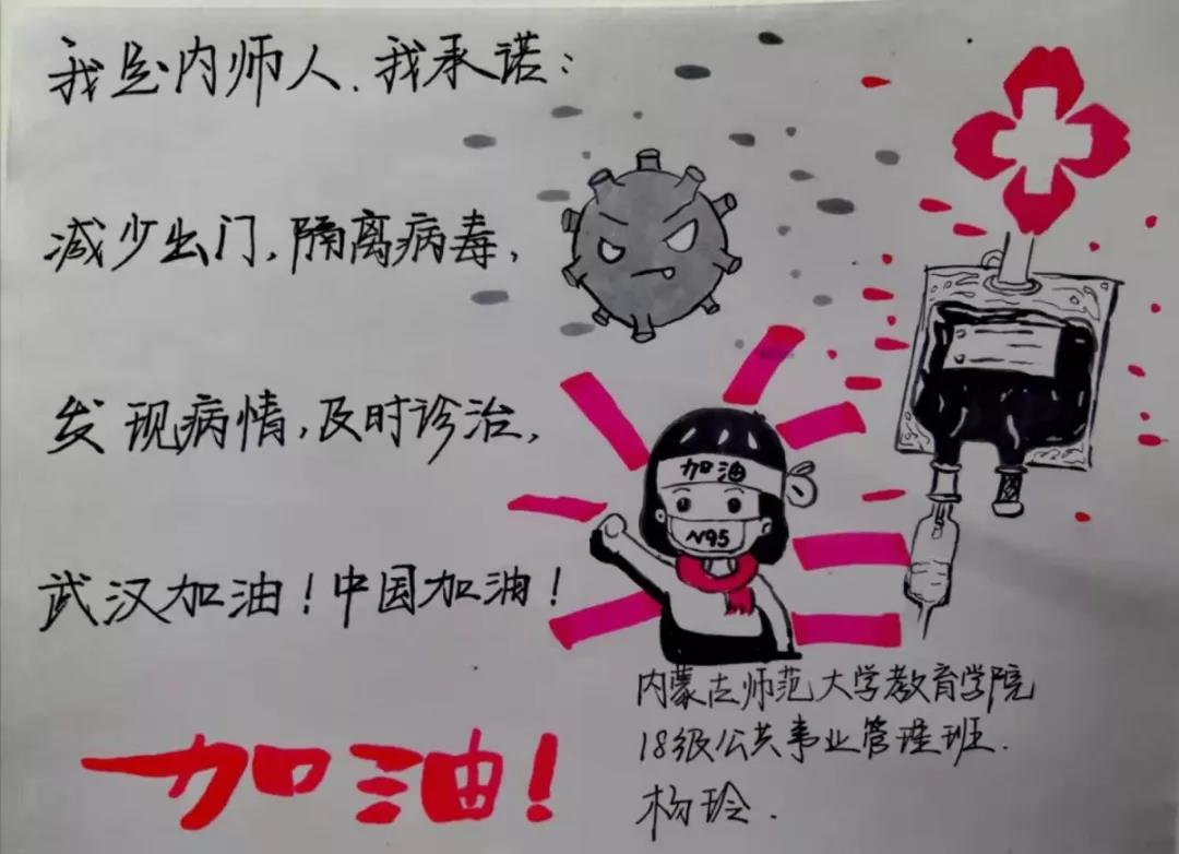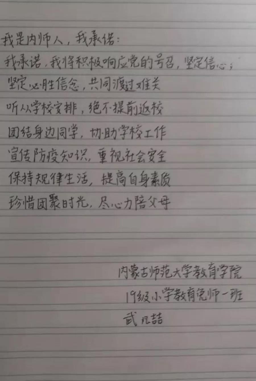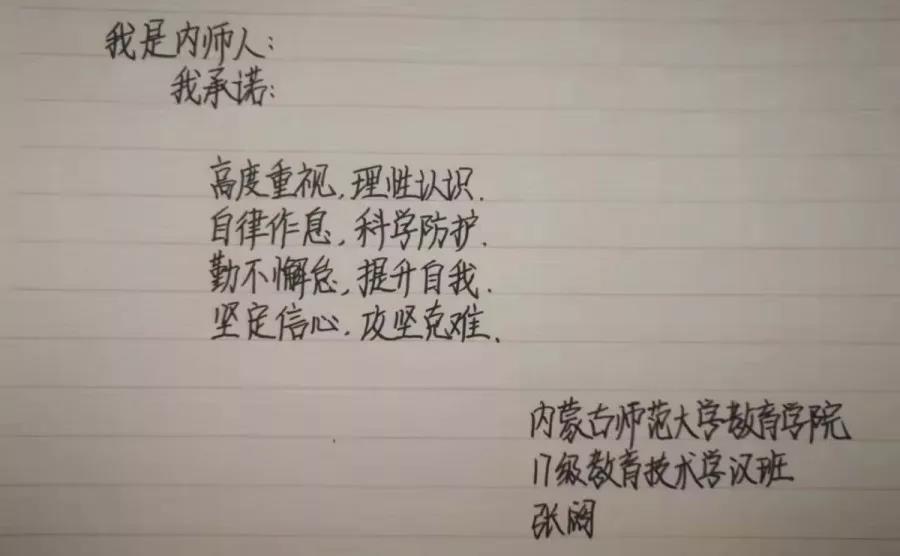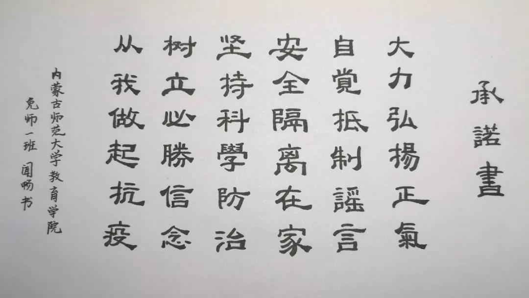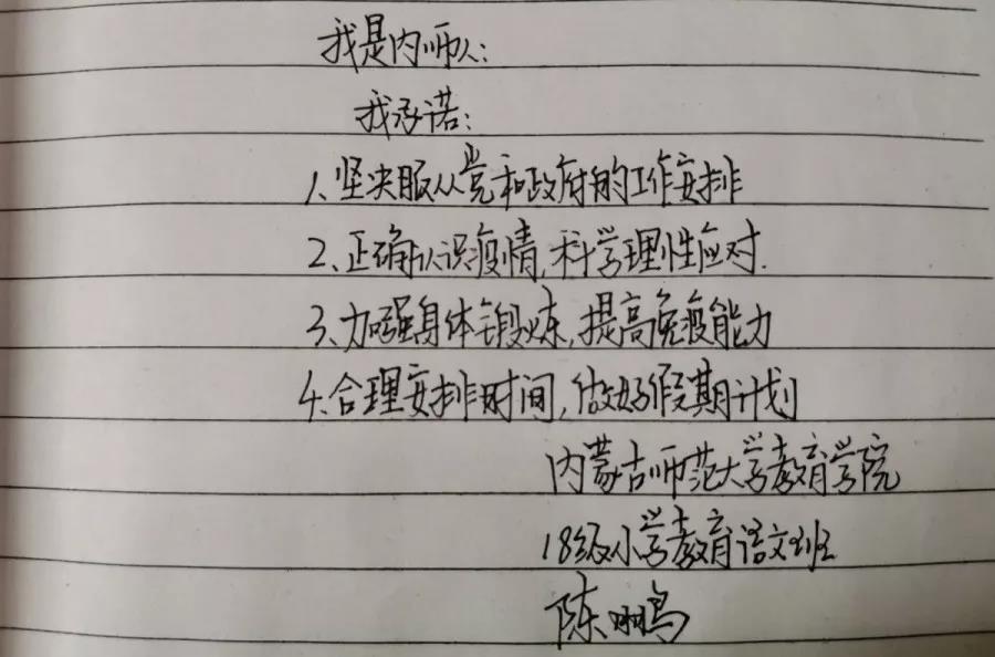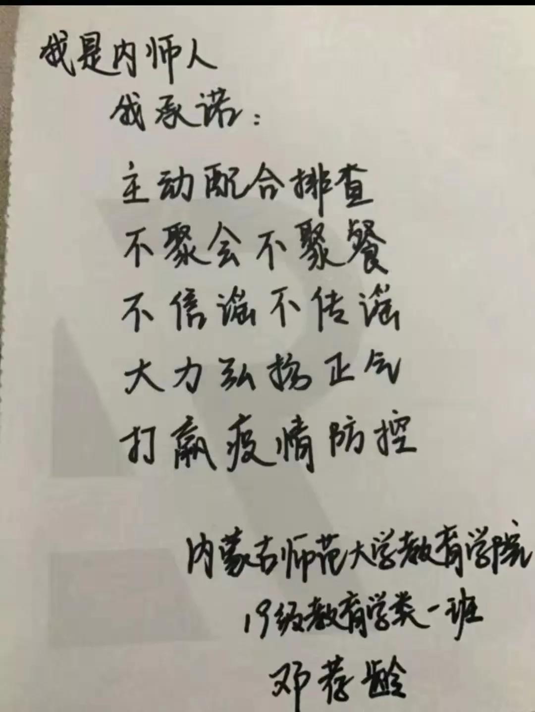 为落实好中央、自治区和学校应对新型冠状病毒感染肺炎相关工作精神,按照共青团中央、自治区团委“关于坚持党的领导,全团动员,在疫情防控阻击战中充分发挥共青团生力军和突击队作用的通知”要求,配合学校团委开展共青团防控疫情“十个一”专题教育活动,引导同学们正确认识疫情,积极应对疫情防控,yl6809永利集团组织开展“防范疫情,从我做起!我是内师人,我承诺!”网络承诺接力活动,发动学生党员、学生干部带领全院学生践行承诺,积极响应号召,服从指挥,保持联络通畅,不提前返校,做到戴口罩、勤洗手,少出门、不聚餐,不信谣、不传谣、不造谣,做运动、不虚度。同学们写下承诺,以笔战“疫”,用实际行动彰显当代大学生的责任与担当,与前线的“逆行者”共同筑起“抗疫”新长城!