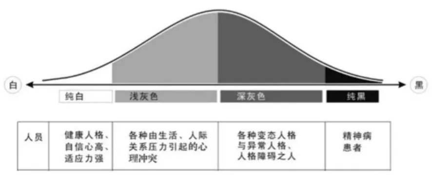 如果将人的心理正常比作白色,心理不正常比作黑色,那么在白色与黑色之间存在着一个巨大的缓冲区域——灰色区域。我们绝大部分人的心理健康状况都处在中间的灰色区域,也就是说绝大部分人都有这样或那样的心理健康问题。