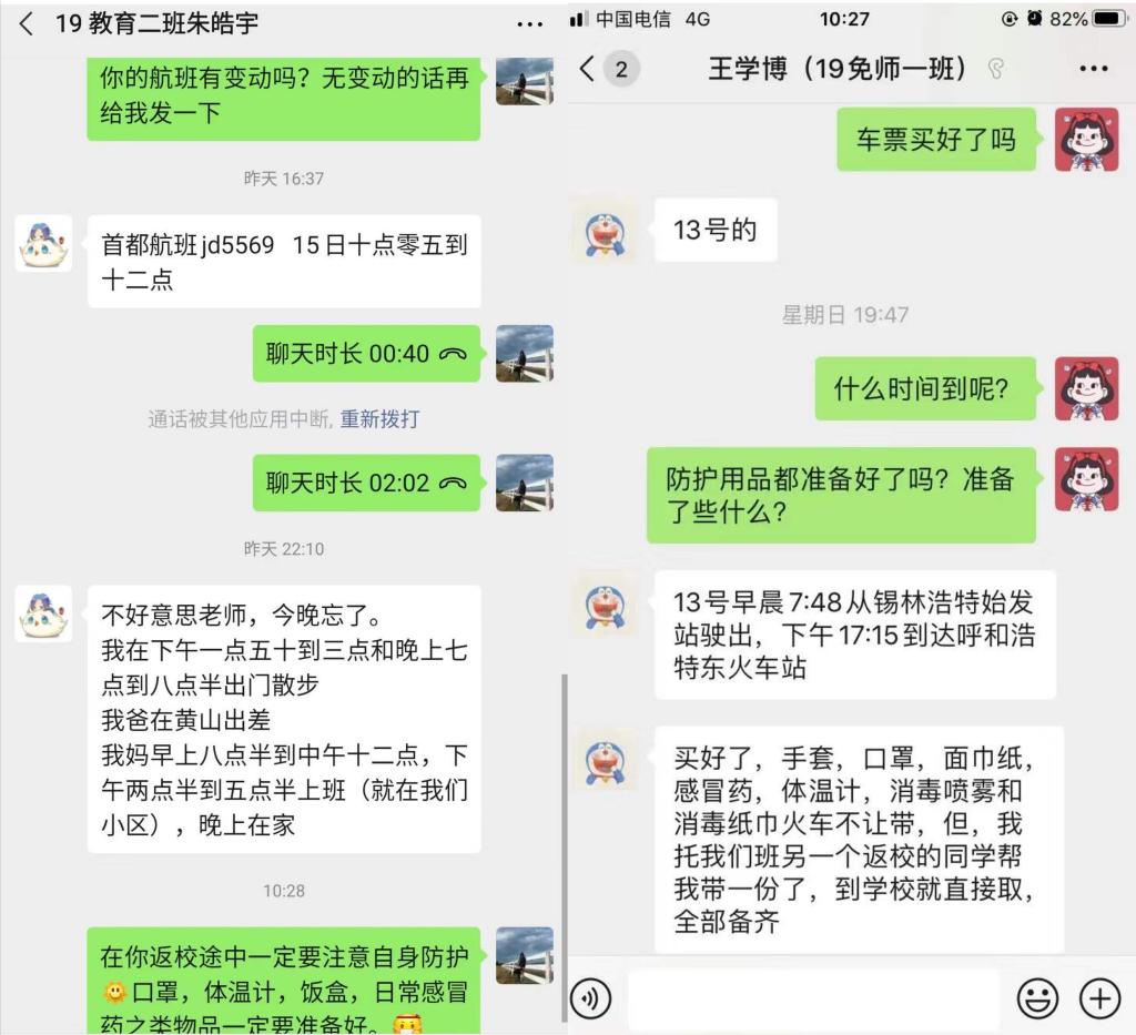 在迎接学生返校复课的过程中,学院辅导员和返校学生建立了一对一的联系,关注学生返校前的行程、个人信息、个人防护准备等情况。为切实保障返校学生的生命安全和身体健康,学院还为返校的同学和湖北籍的同学准备了消毒用品和防护大礼包,让同学们安心返校,安全上学。