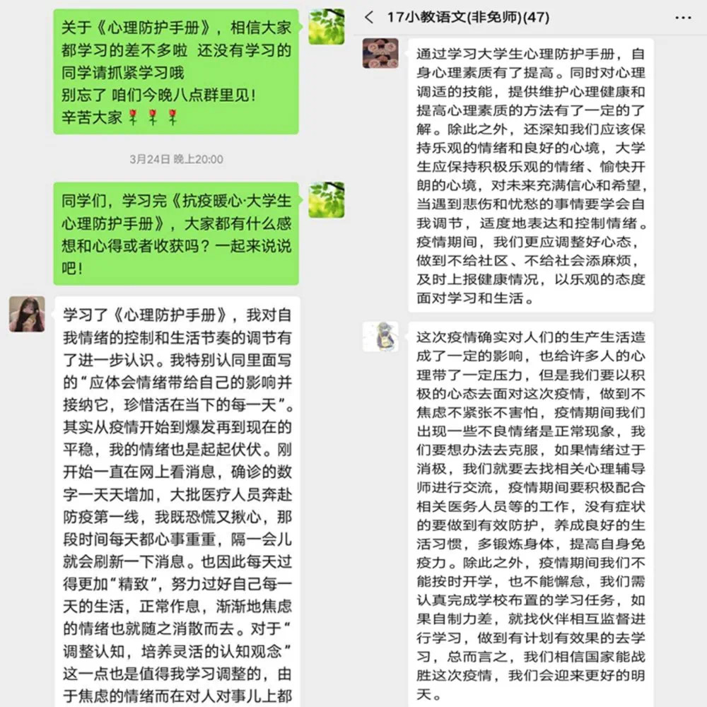 为增强学生的心理保健意识、帮助学生调整心态、积极适应特殊时期的学习生活,我组织班内同学对《手册》内容进行了线上学习,并在3月24日晚8点在班级微信群内进行了感想与心得交流。