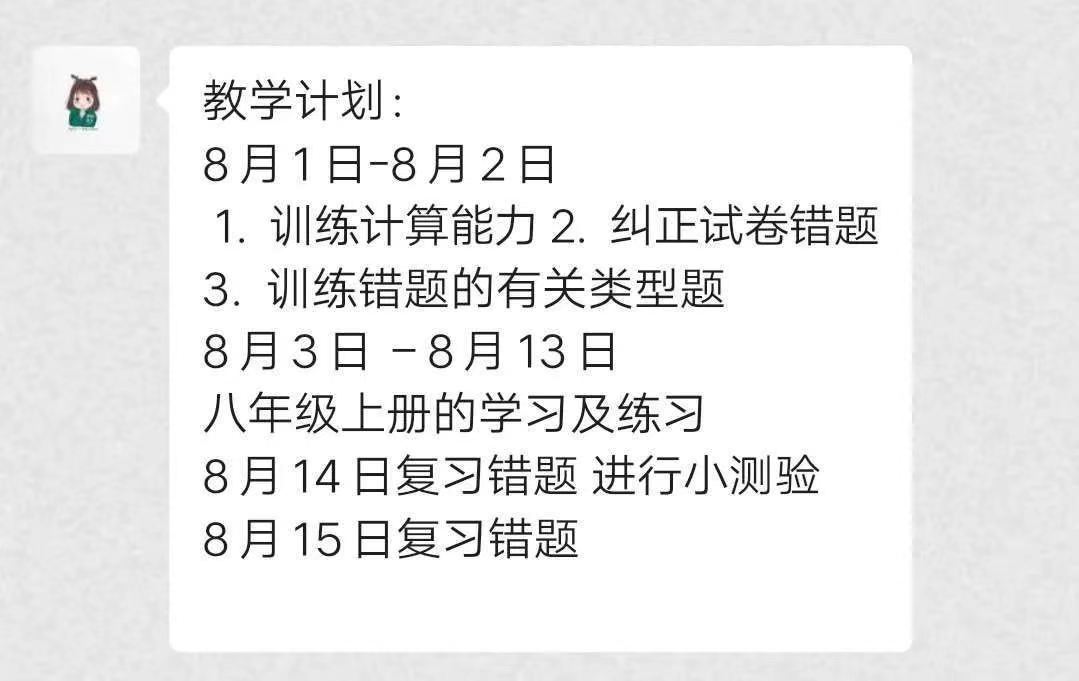 辅导同学的数学成绩在80分以上,在部分内容上有一定的盲点及不足,希望通过此次课程巩固初一所学知识。通过此次课程加强做题能力并巩固其数学基础,加深对初一数学内容的印象。
