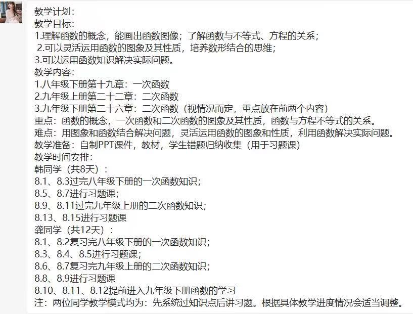 此次补习时间紧任务重,不能把范围定的太广,求精不求多。我把本次为期十几天的教学放在函数这块,通过了解,两位同学都有必要重头系统的学习函数的知识。通过此次学习,初步要使两位同学到达一个能独立解决大部分函数题的程度