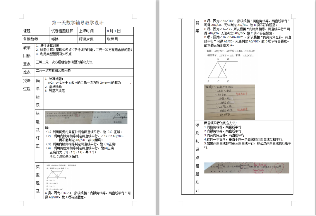 经过六天的教学,我和学生配合的很好,学生自己也很有上进心,对待课上学习很认真,课后作业完成情况也非常好。在过去的六天里重点进行了初一数学:有理数、整式的加减、实数、一元一次方程和二元一次方程组的专题训练。在开启新章节的内容前会用10到20分钟回顾知识点,之后进行专题训练。经过几天的磨合后,我发现自身还需改进的地方有尽量给学生多的思考时间,让学生好好阅读题目,理解题目。选题也应该严谨,避免所选题目中有错题、表述不清的题目等。除此之外应尽量让学生自己讲述对题目的思路以及计算过程,鼓励学生多说,敢说,这样也有助于学生理顺自己的思路,保证自己的思路清晰。