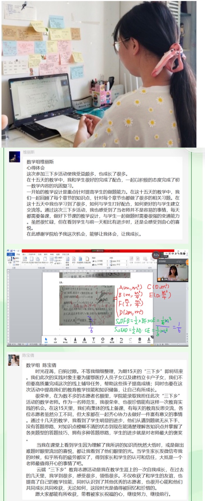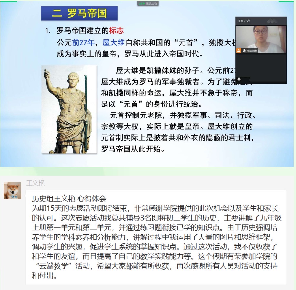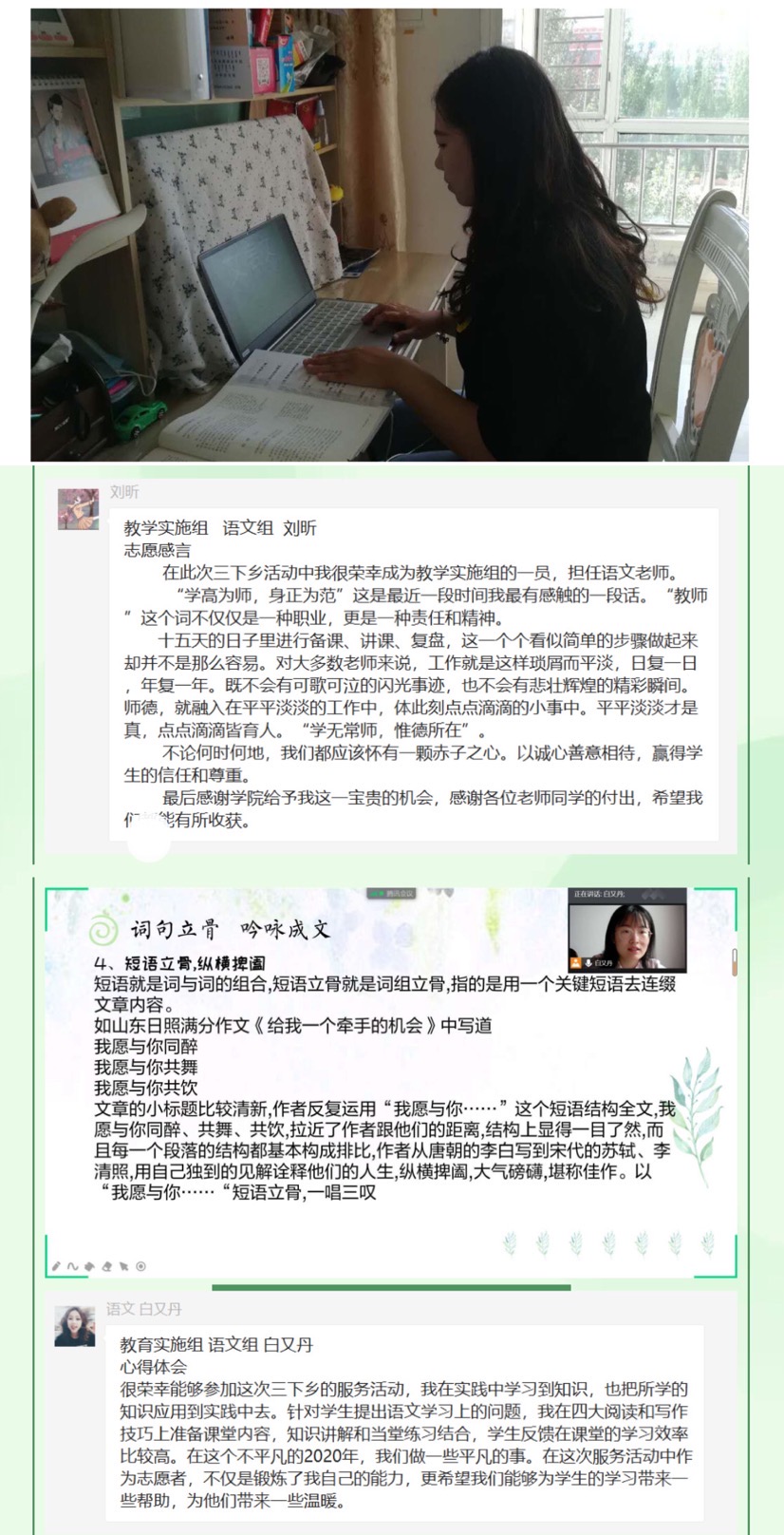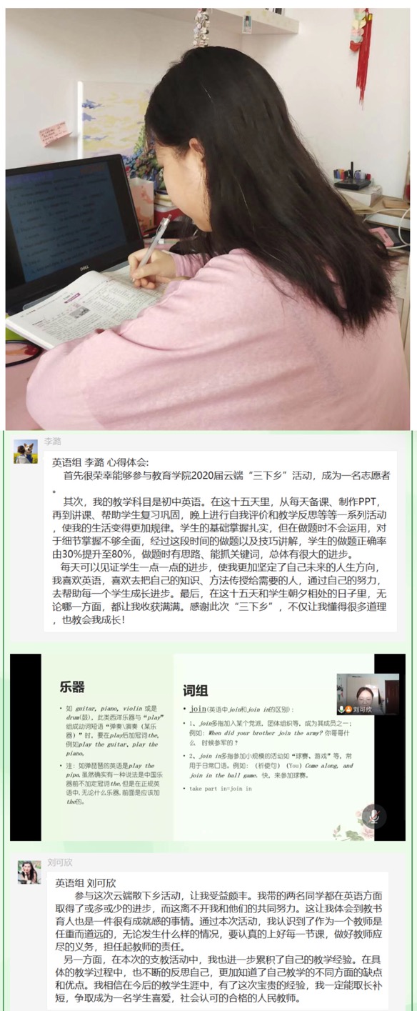 岁月不居,时光如流。为期十五天的暑期云端“三下乡”教学工作即将结束。在这短暂而充实的十五天中,教学实施组的志愿者们发挥专业特长,秉承志愿精神,认真负责地完成教学工作,付出很多心血和努力的同时也得到了锻炼和成长。志愿者们在志愿活动中积极交流经验,分享教学成果,共享心得体会,形成了良好的学习和志愿服务氛围,为志愿者们本次的教学活动画上了圆满的句号。