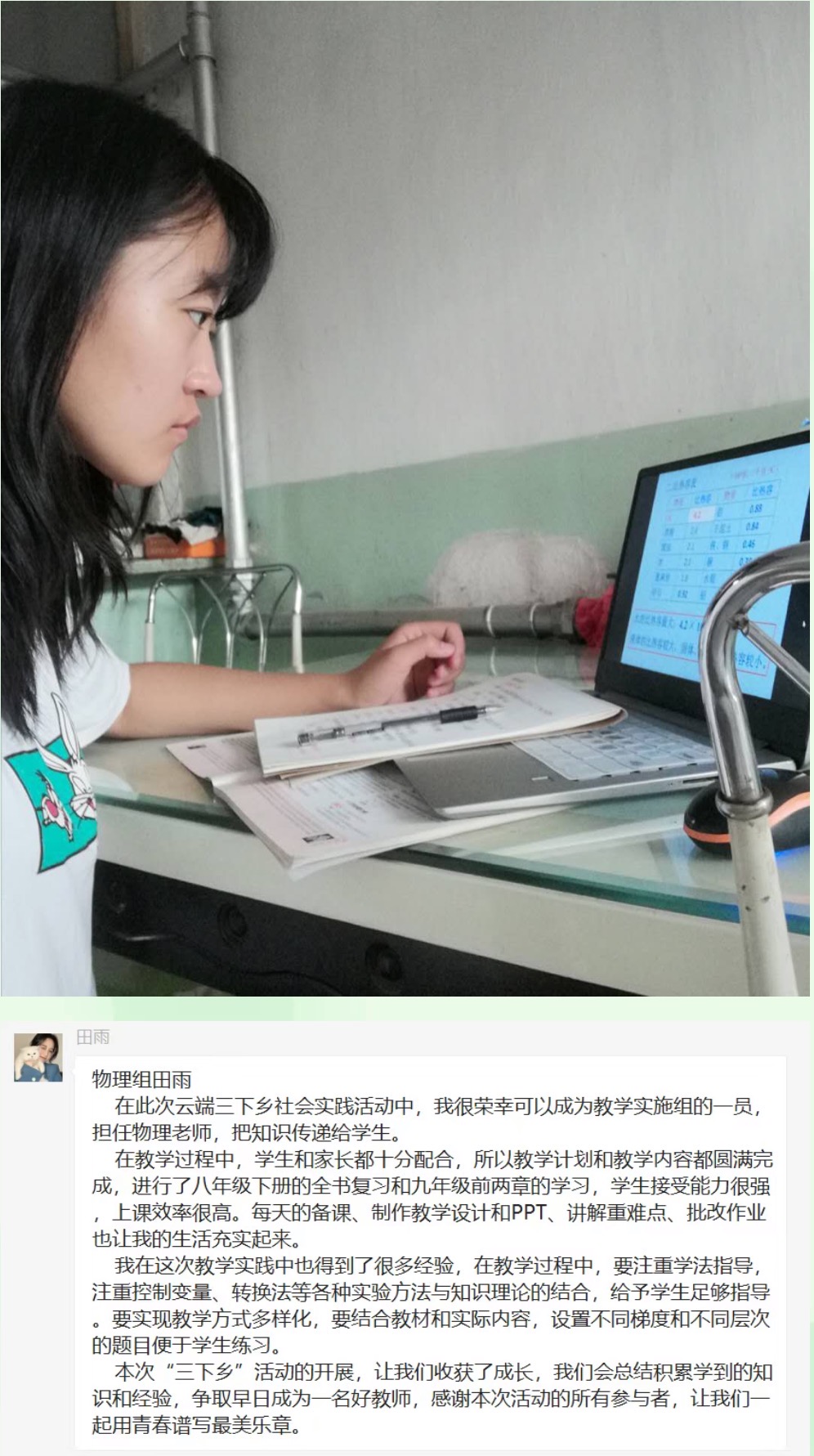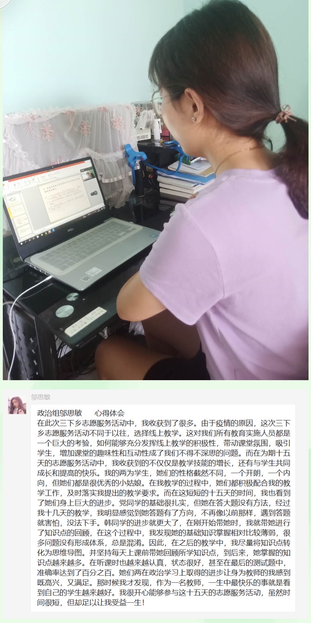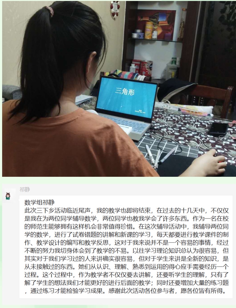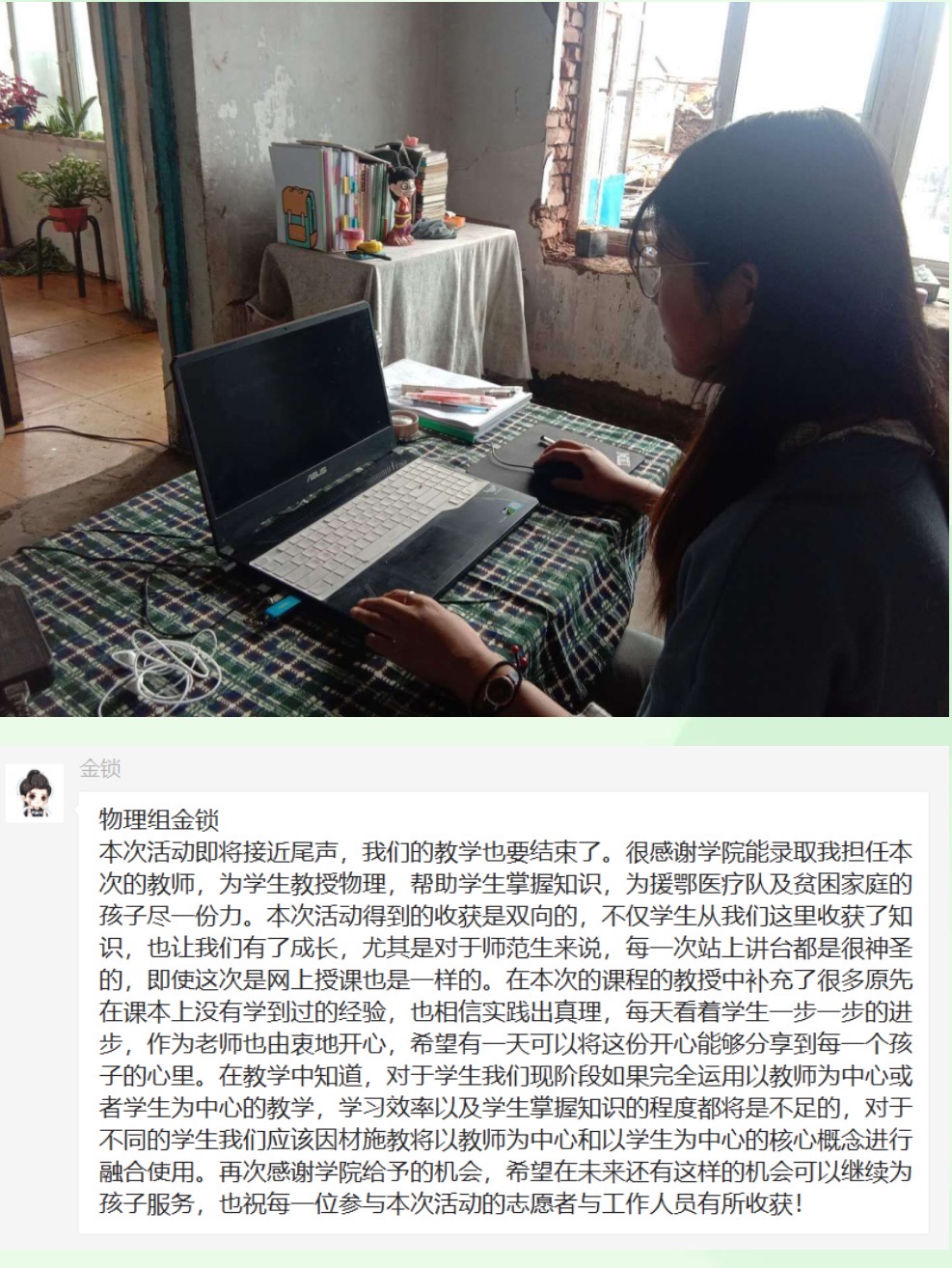 岁月不居,时光如流。为期十五天的暑期云端“三下乡”教学工作即将结束。在这短暂而充实的十五天中,教学实施组的志愿者们发挥专业特长,秉承志愿精神,认真负责地完成教学工作,付出很多心血和努力的同时也得到了锻炼和成长。志愿者们在志愿活动中积极交流经验,分享教学成果,共享心得体会,形成了良好的学习和志愿服务氛围,为志愿者们本次的教学活动画上了圆满的句号。