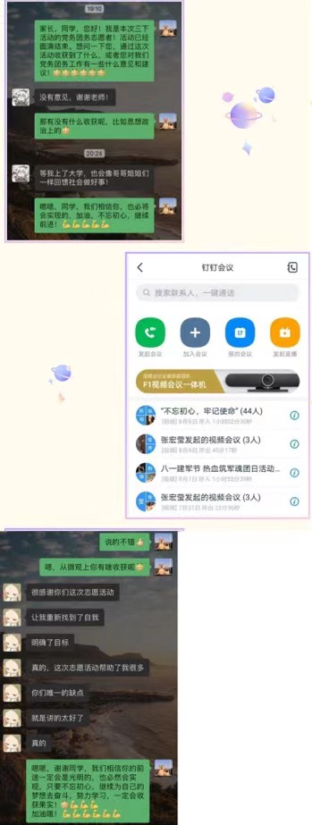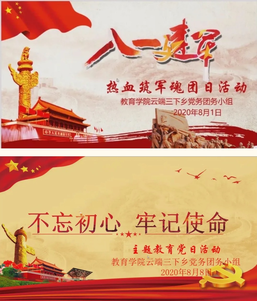 党务团务组,一直秉承着听党指挥,向志愿者,向团员党员传播先进思想的原则,尽心尽力的在这次繁忙且充实的三下乡活动中,为党员团员们送来党性光辉的洗礼。从八一建军节的《热血筑军魂》到前几天结束的《不忘初心,牢记使命》。虽然次数不多但是每一次都是深入人心,在与学生以及家长的反馈中得知,他们对于此次的活动安排也是十分满意。在一次次的活动总结中,我们意识到,同志们对于党的思想有很强的求知欲,这也时刻提醒着我们要完善每一次自己的活动内容以及方案,给同学们以更深层次的分享,这样的话,不仅为我们赋予了一种神圣的责任,也让我们收获满满,收获了老师同学的肯定的同时,更收获了对于党团思想的进一步洗礼。在活动中,当然也有我们的不足,但是即使这次的活动结束,我们也会总结经验,在接下来的学习与工作生活中,努力改正,不断学习。