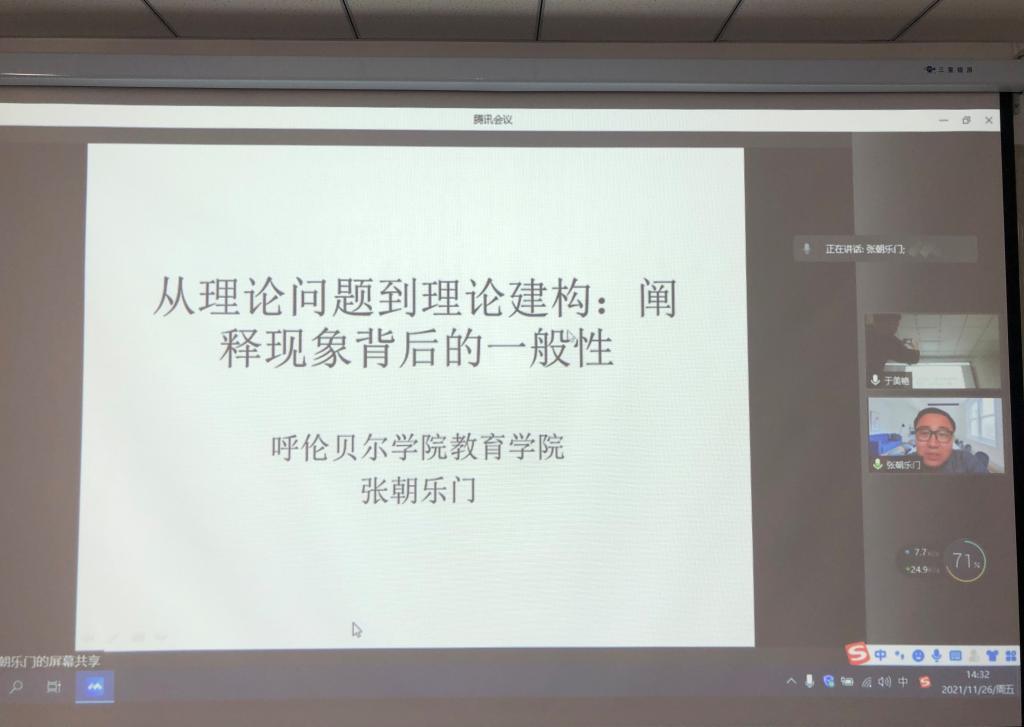 2021年11月26日,我院邀请优秀毕业生代表呼伦贝尔学院yl6809永利集团副教授、硕士研究生导师张朝乐门博士作题为《从理论问题到理论建构:阐释现象背后的一般性》的学术讲座。张朝乐门博士结合自己的博士论文,围绕理论的属性与特征、“民族高等教育”概念的历史、“两校一班”促生的理论问题、“民族高等教育组织系统”理论建构等内容,进行阐述和分析,并分享了读书、写文章的方法、经验。讲座由阿木古楞博士主持,民族教育学、教育学原理专业研究生参加。
