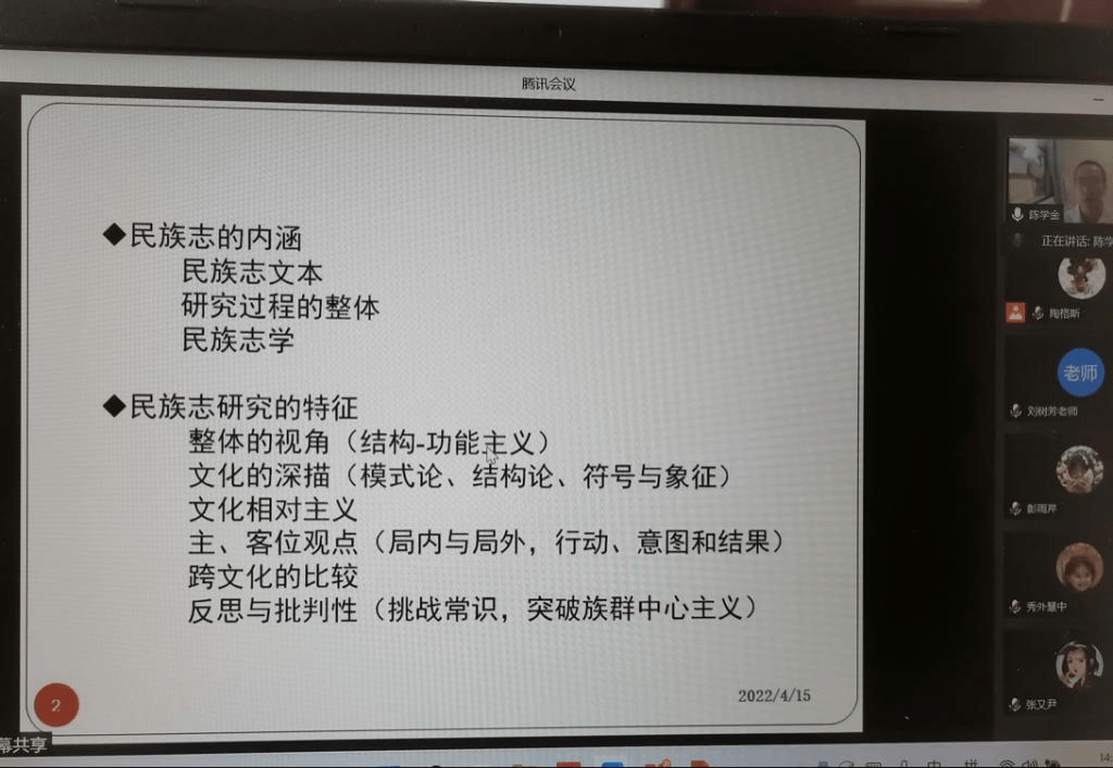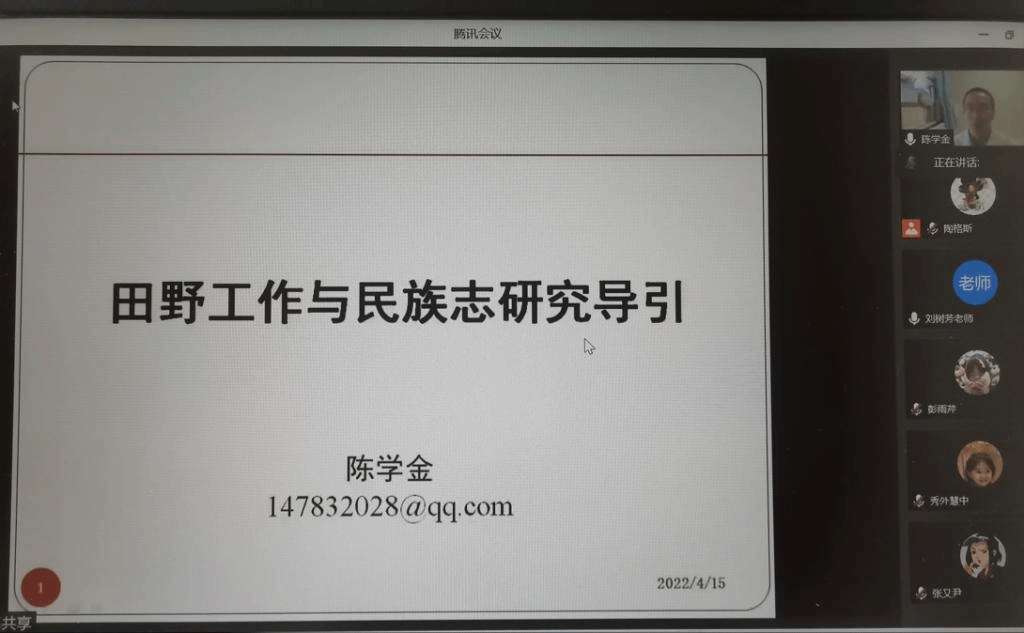 2022年4月15日,我院邀请北京市社会科学院社会研究所副研究员陈学金博士作题为《田野工作与民族志研究导引》的学术讲座。陈学金博士对民族志的内涵、特征、不同学科民族志研究的异同、民族志和田野工作之间的关系进行探讨,在并结合三案例,围绕田野工作开展的方式方法、研究问题的凝练、文本的架构、理论的探讨与分析等多方面内容进行了深入阐述。讲座由yl6809永利集团陶格斯博士主持,本校民族教育学、课程与教学论等专业的研究生和本科生及校外师生参加。提问与交流环节中,陈学金博士推荐了人类学方法论的书籍,并分享了读书、写文章的方法与经验。