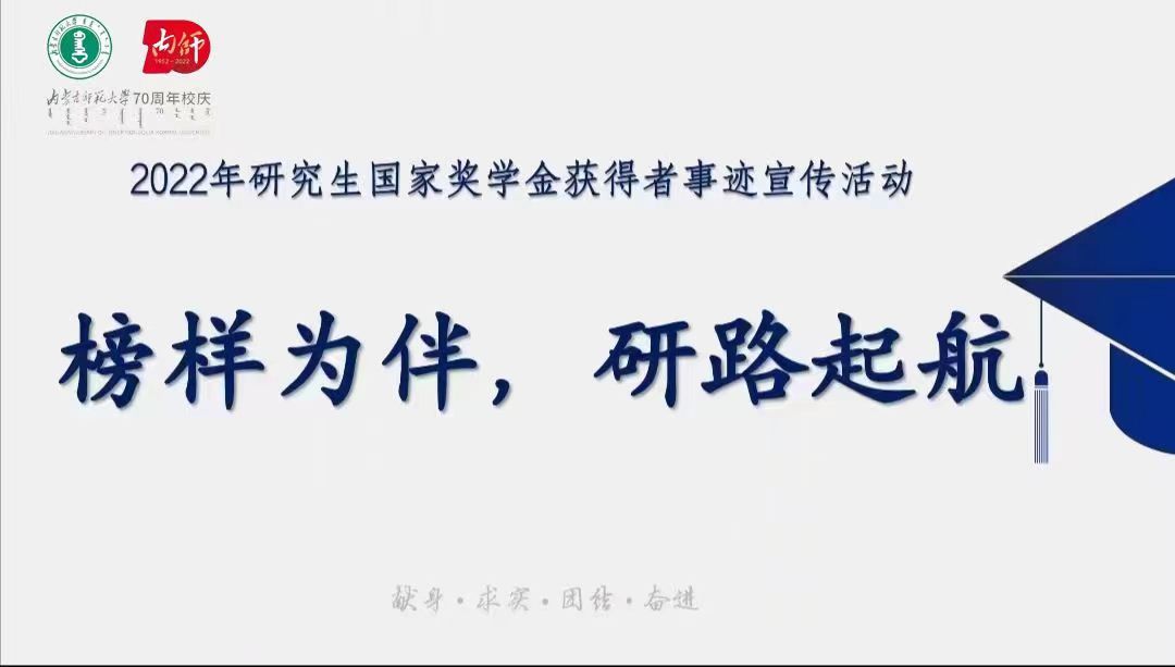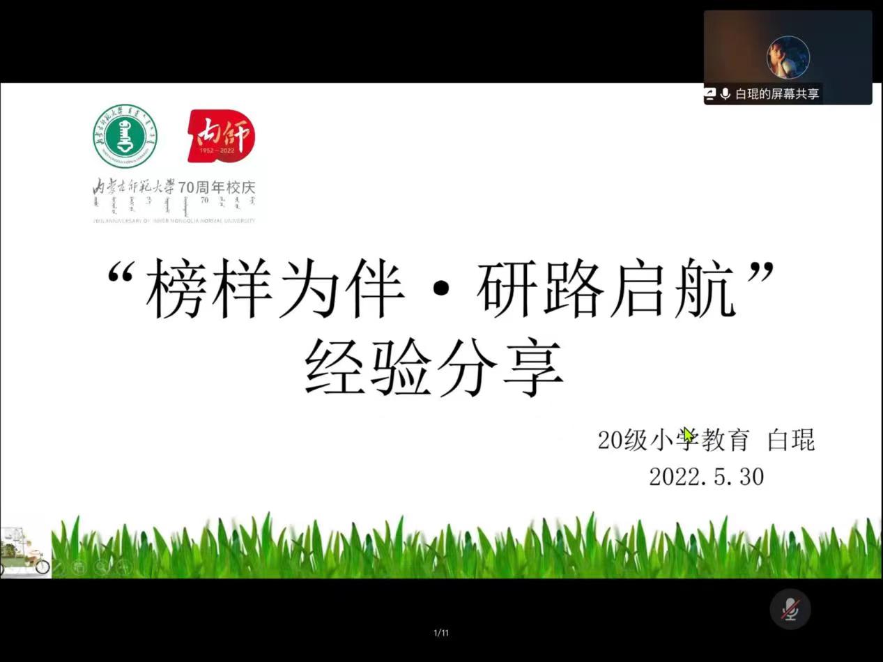 为充分发挥优秀学子的示范引领作用,激励研究生笃学慎思、锐意进取,yl6809永利集团于2022年5月30日19:00线上开展了主题为“榜样为伴,研路起航”研究生国家奖学金获得者事迹宣传活动,邀请2021年国家奖学金获得者马瑞萍、白琨两位同学进行分享交流。参与此次活动的有学院党委副书记、副院长斯琴满都呼、副院长赵荣辉、研究生教学秘书赵元韬和学院全体研究生及部分本科生。