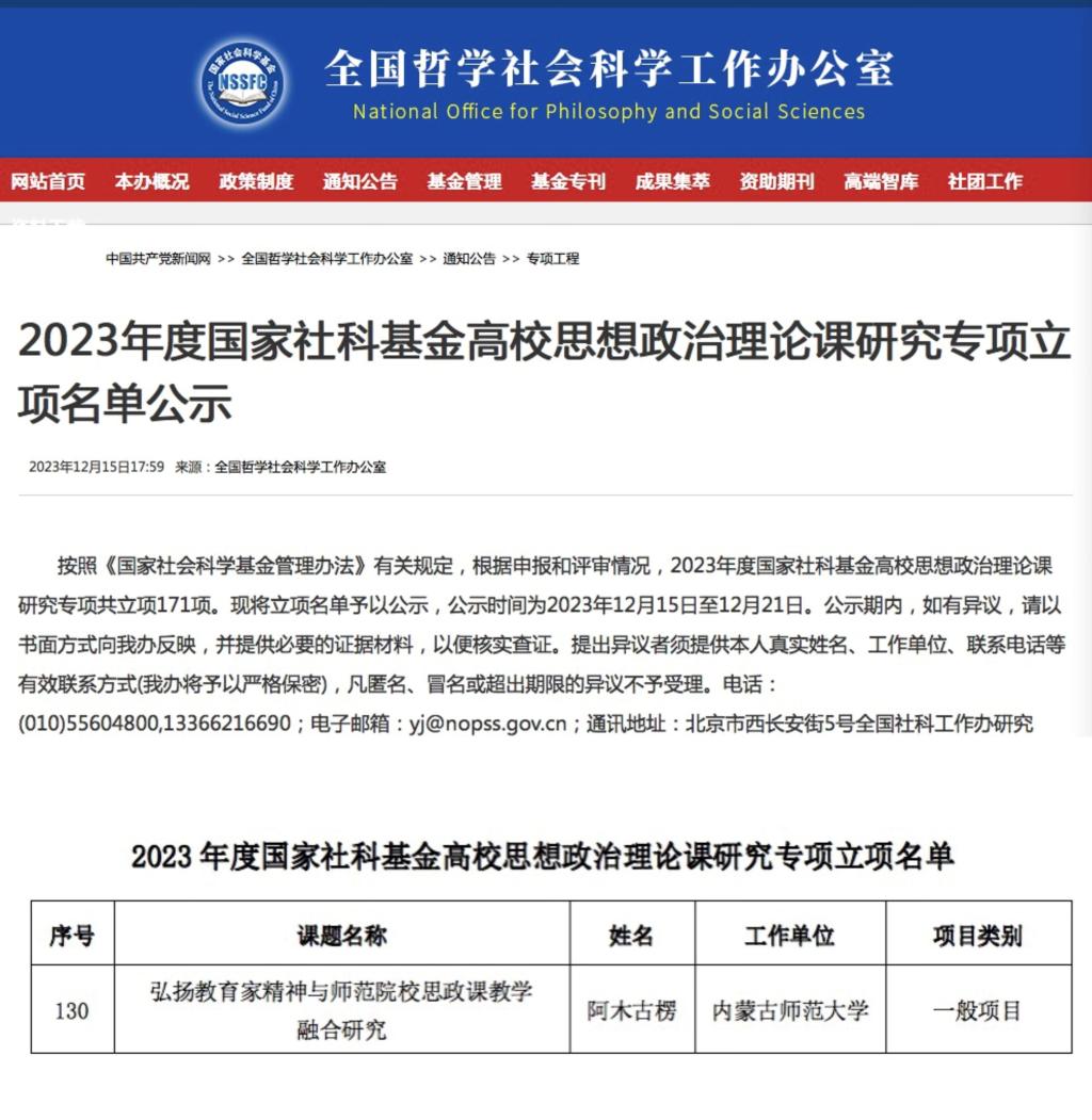 近日,全国哲学社会科学工作办公室公布2023年度国家社科基金高校思想政治理论课研究专项立项名单。我院阿木古楞博士申报的“弘扬教育家精神与师范院校思政课教学融合研究”获批2023年度国家社科基金高校思想政治理论课研究专项课题。