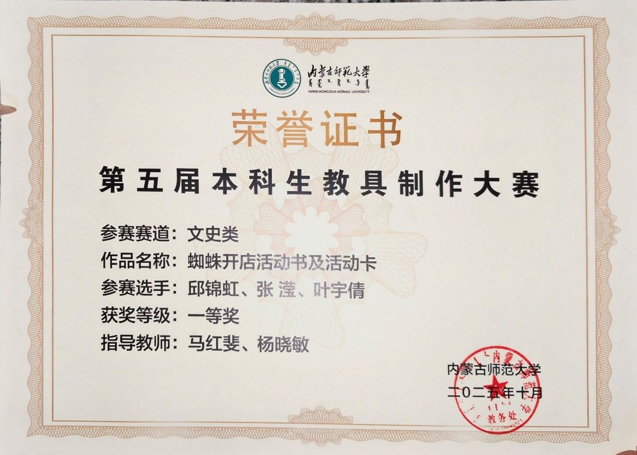 在学校第五届本科生教具制作大赛中,我院小学教育专业语文班邱锦虹、张滢、叶宇倩三位同学共同设计制作的教具《蜘蛛开店活动书卡》荣获佳绩。