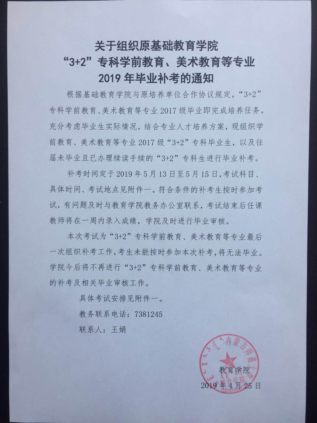本次考试为“3+2”专科学前教育、美术教育等专业最后一次组织补考工作,考生未能按时参加本次补考,将无法毕业。学院今后将不再进行“3+2”专科学前教育、美术教育等专业的补考及相关毕业审核工作。