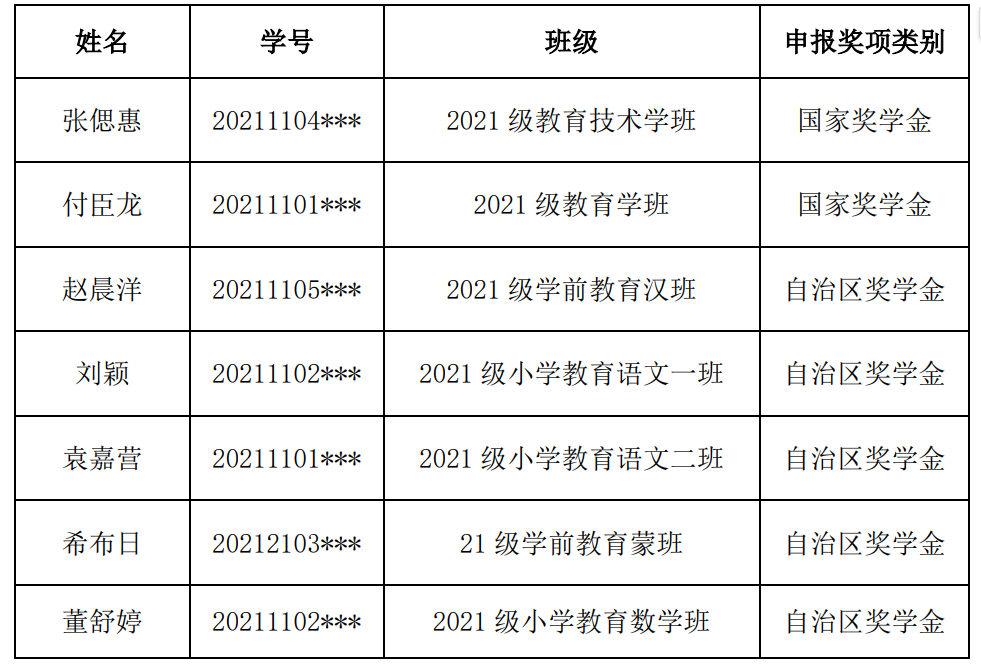 依据《yl6809永利集团国家奖学金评选办法》(校发[2008]45号)、《关于开展2022—2023学年国家奖学金评审工作的通知》、《关于开展2022—2023学年自治区奖学金评审工作的通知》、《yl6809永利集团“国家奖学金、内蒙古自治区奖学金”评选工作实施细则》等文件精神,经过学生申请、班级推荐以及学院党政联席会议讨论,拟推荐以下学生分别申报国家奖学金和内蒙古自治区奖学金。