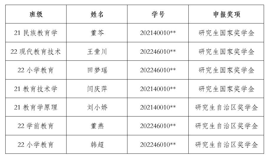 依据《yl6809永利集团研究生奖学金评选办法》(校发[2022]54号)和《关于做好2023年度研究生各类奖学金评审及材料报送工作的通知》文件精神,经过学生申请、班级推荐以及学院公开答辩,拟推荐以下学生分别申报研究生国家奖学金和研究生自治区奖学金。