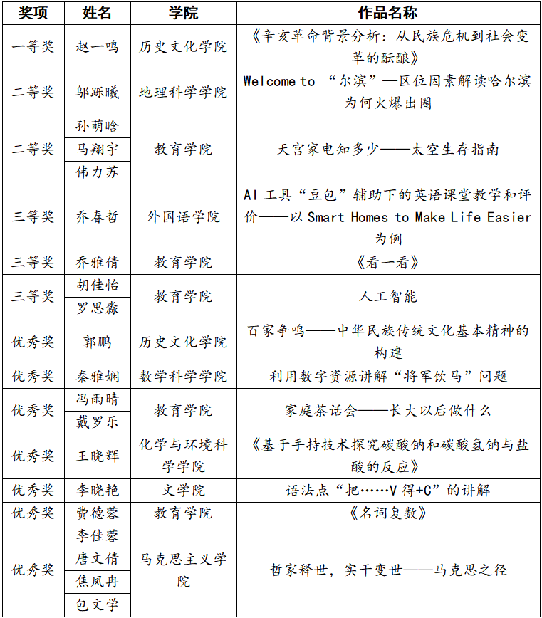 评委会秉承公平公正公开的原则,通过教学选题、技术规范、教学内容、教学效果、教学特色等多个角度的综合评定后,最终评出一、二、三等奖及优秀奖,共13个奖项。